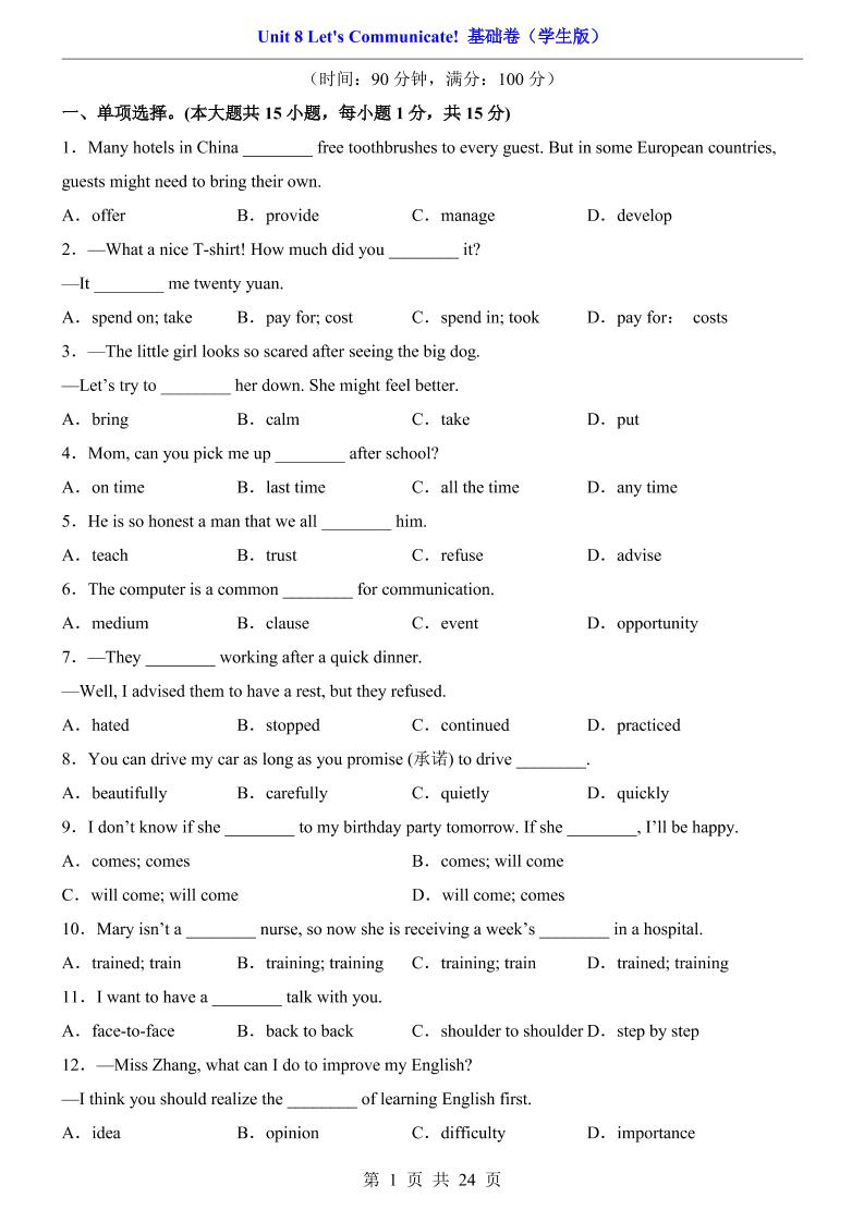 欧珂网络 英语 八年级上英语Unit8基础卷(人教版) https://oukel.com/87107.html